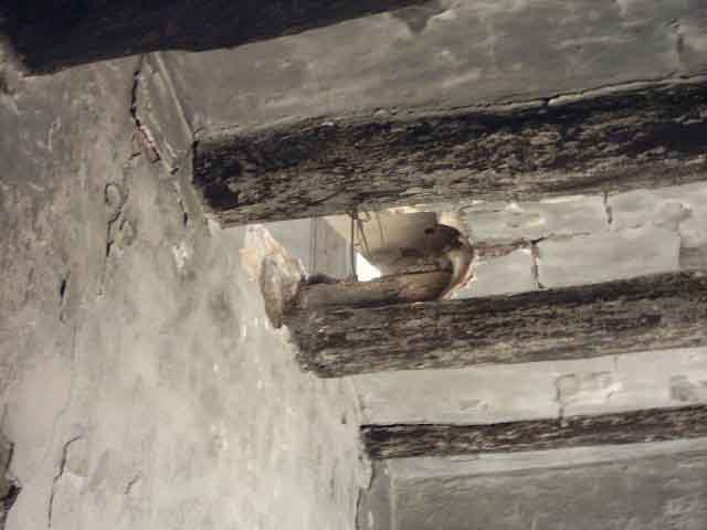 The pics show two holes where two of the chimneys were. One of them is pretty bad. It looks like somebody used the fireplace when there was no conduit for the smoke any more and two beams burnt.
